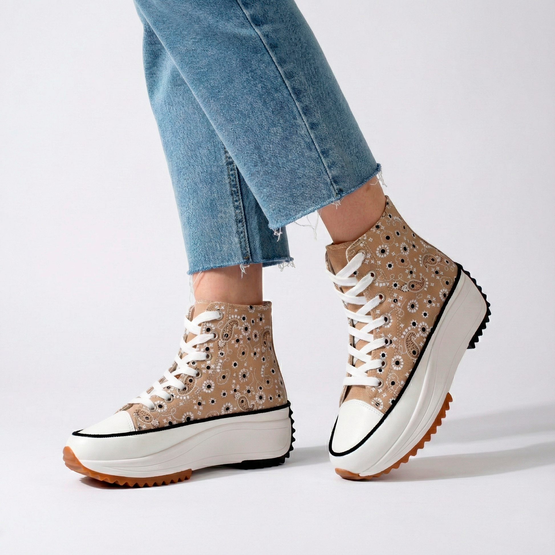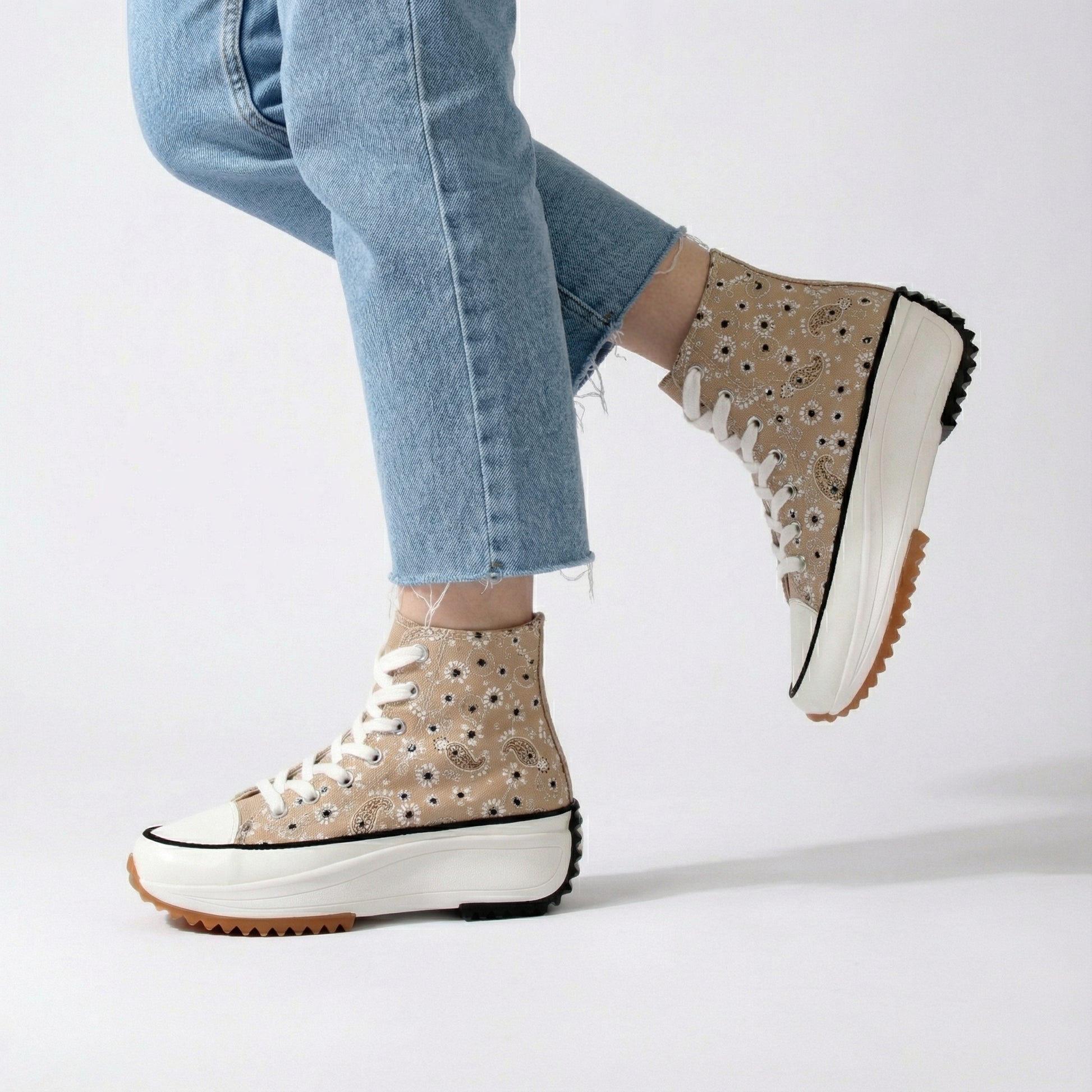 Estas zapatillas combinan la silueta clásica del botín de lona con una suela de plataforma moderna y agresiva, creando un look que no pasa desapercibido. El diseño presenta un estampado estilo bandana (Paisley) en tonos beige y arena, perfecto para quienes buscan un calzado neutro pero con mucha personalidad.