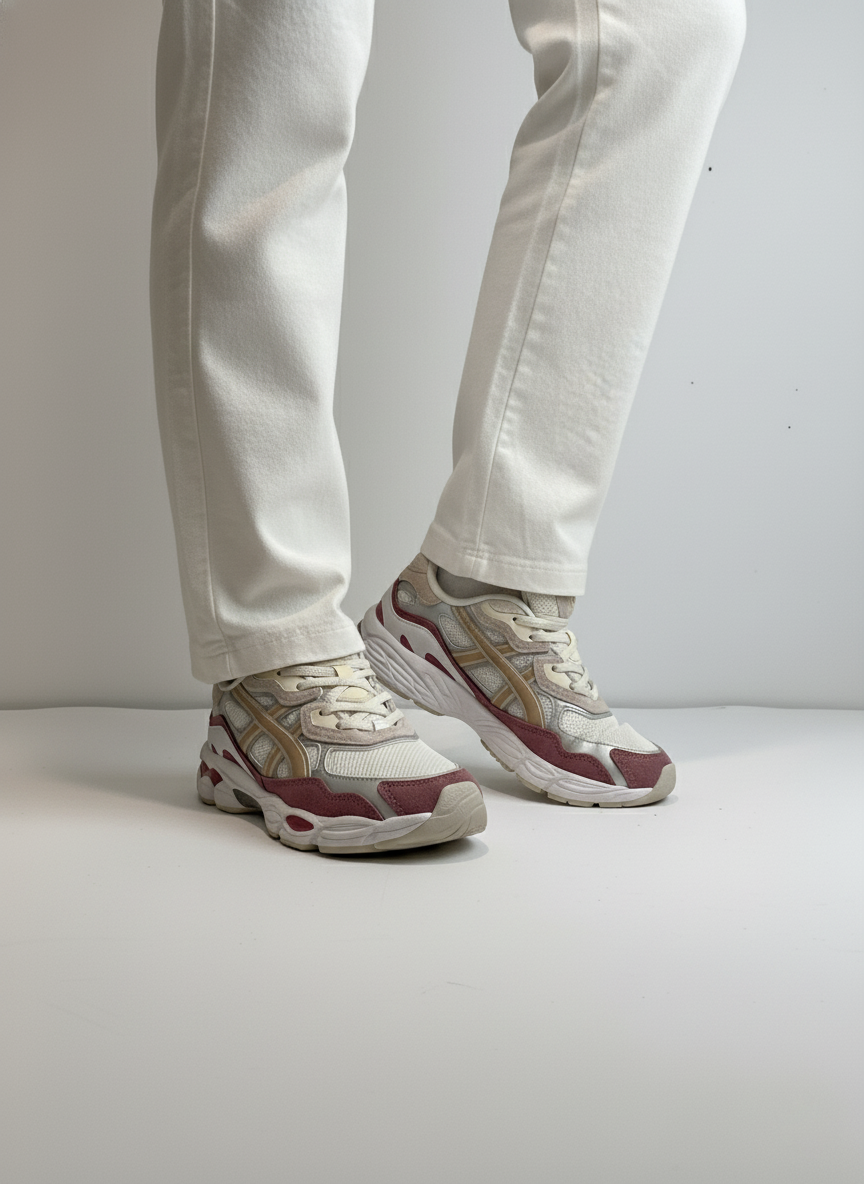 Materiales Mixtos: Confeccionadas con una combinación de malla transpirable en la puntera y los laterales, junto con refuerzos sintéticos o de suede en color vino y beige claro para mayor soporte y durabilidad.