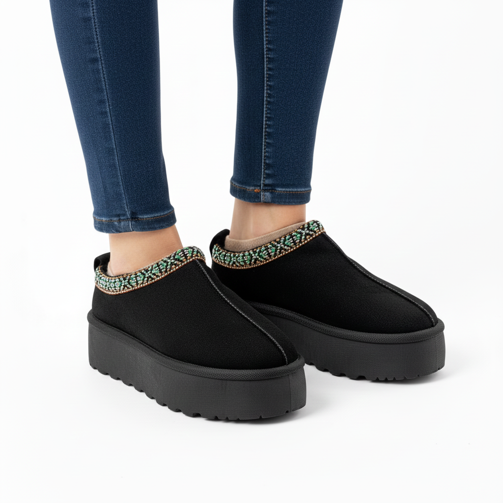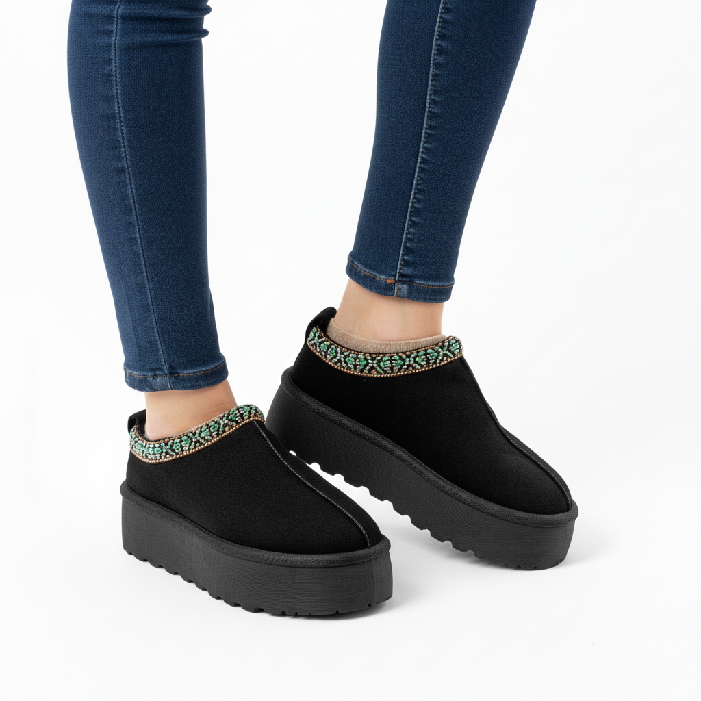 El detalle distintivo se encuentra en el borde superior, donde un ribete de cuentas con un patrón geométrico en tonos turquesa y bronce aporta un elegante toque étnico y colorido. El diseño sin cordones permite ponérselas y quitárselas con facilidad, mientras que el interior está ligeramente acolchado para un ajuste confortable.